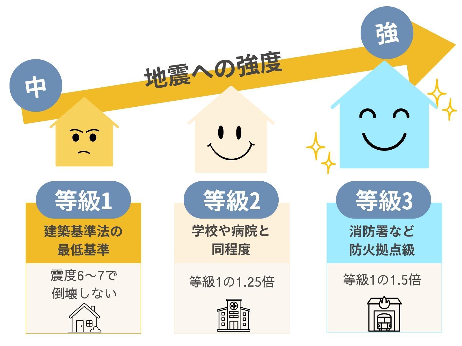 耐震等級は1から3まであり、等級1は建築基準法で定められた最低限の基準を満たすレベルになります。等級2はその1.25倍、等級3は1.5倍の耐震性能を有するとされています。