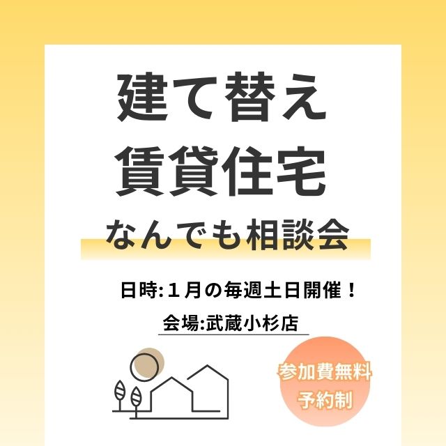 武蔵小杉東急スクエア店では、1月の土日に、建て替え・賃貸住宅なんでも相談会を開催します!お金のこと、プランのこと、土地のことなど、家づくりに関わることならなんでも相談できる機会です。まずは「話す」「聞いてみる」ことから家づくりを始めませんか?災害に特化した家づくりのノウハウについても相談できます!